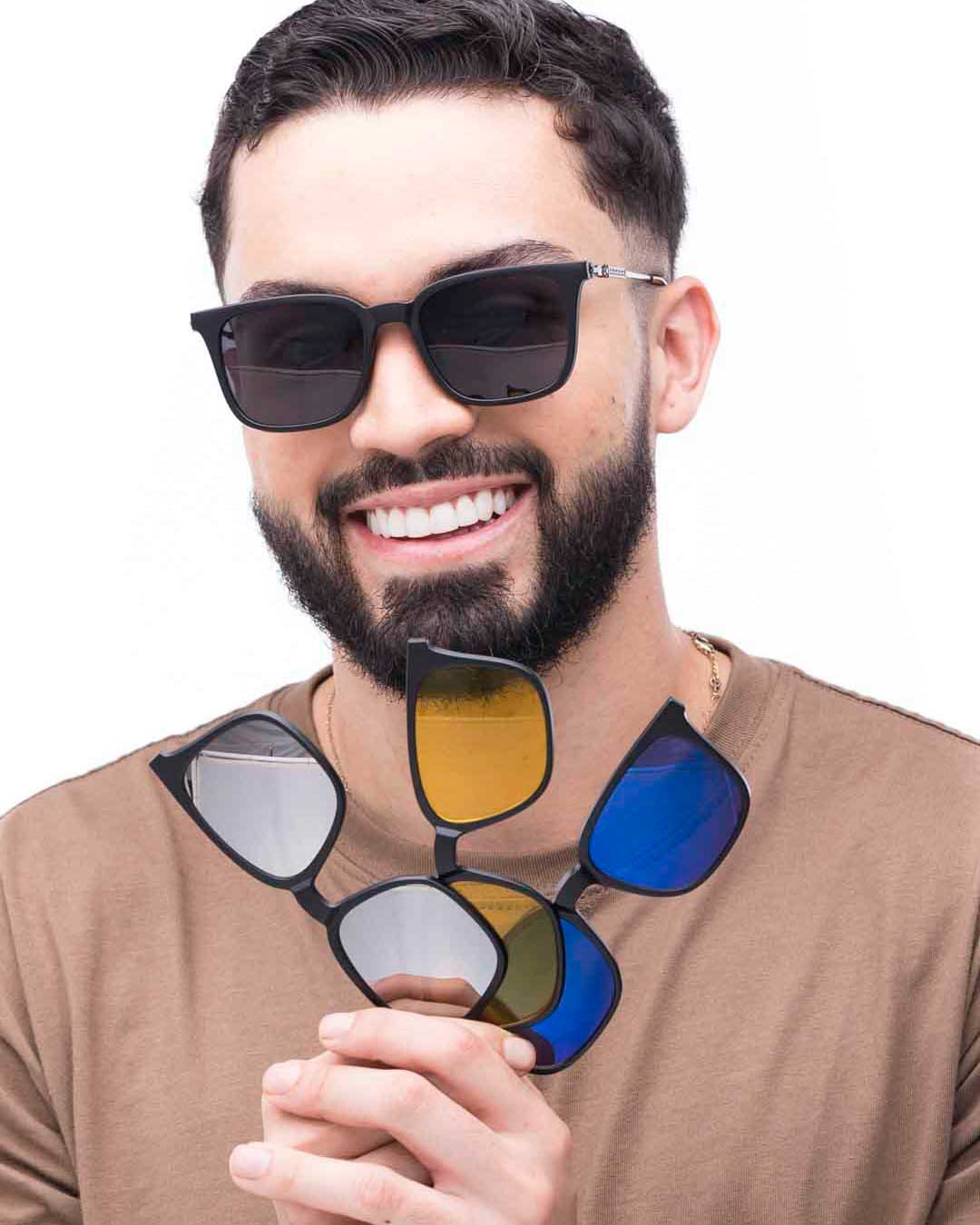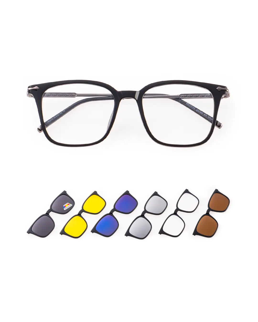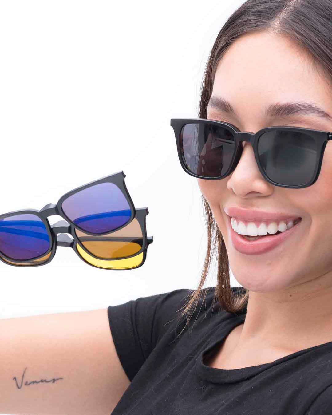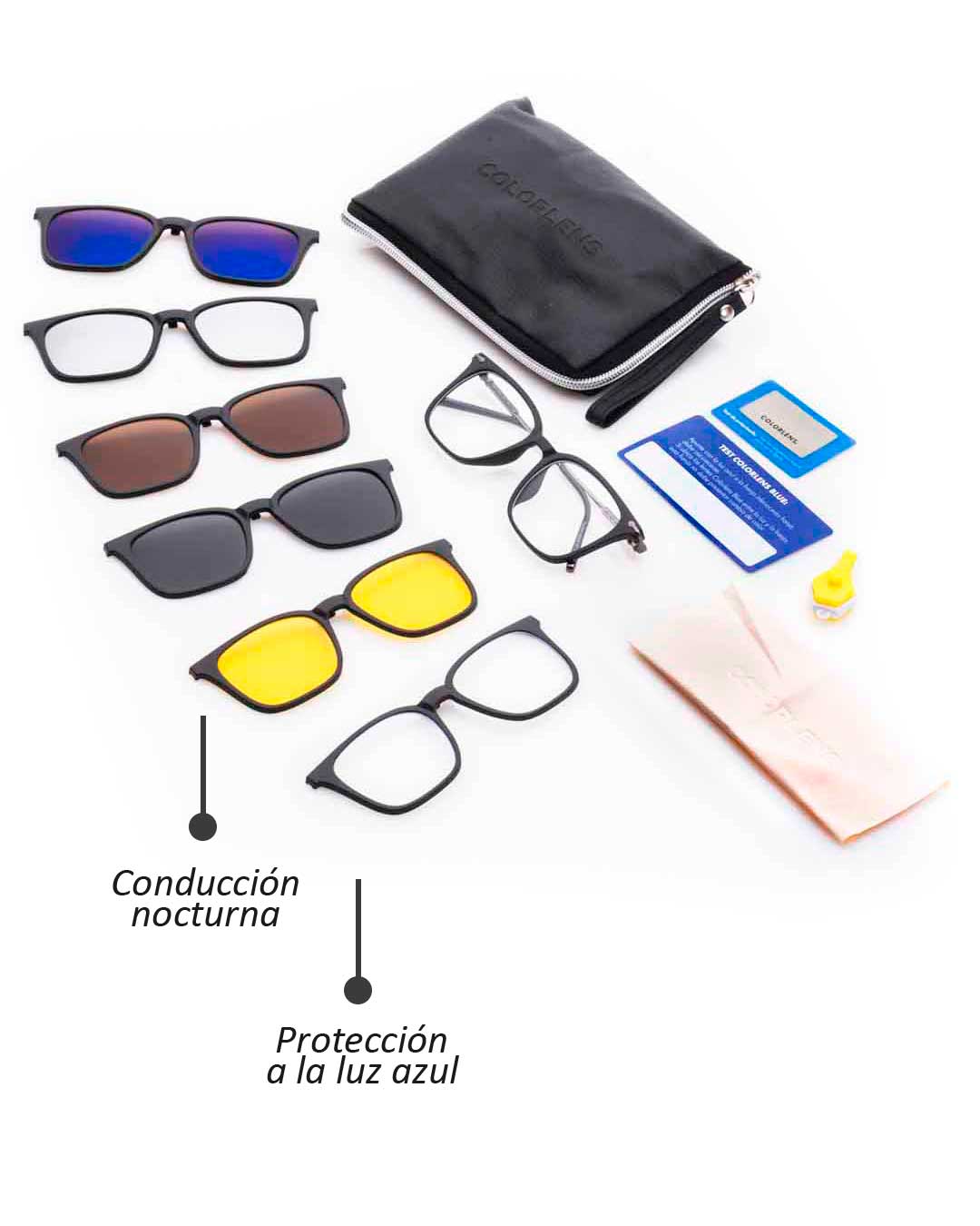 Gafas que constan de 1 montura fabricada en nylon TR90, material aeroespacial creado en Suiza, de alta resistencia y flexibilidad. A la montura se pueden instalar lentes con fórmula médica en cualquier óptica de confianza, y sobreponer, mediante ajuste magnético y clip de seguridad, 6 diferentes lentes funcionales con los siguientes usos: