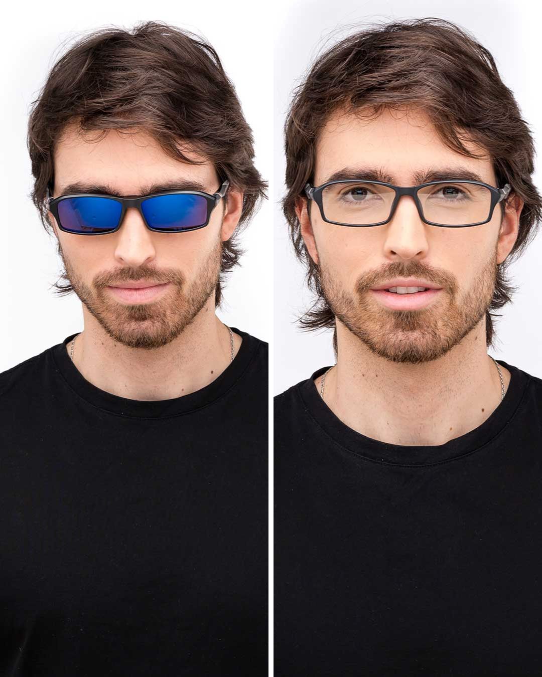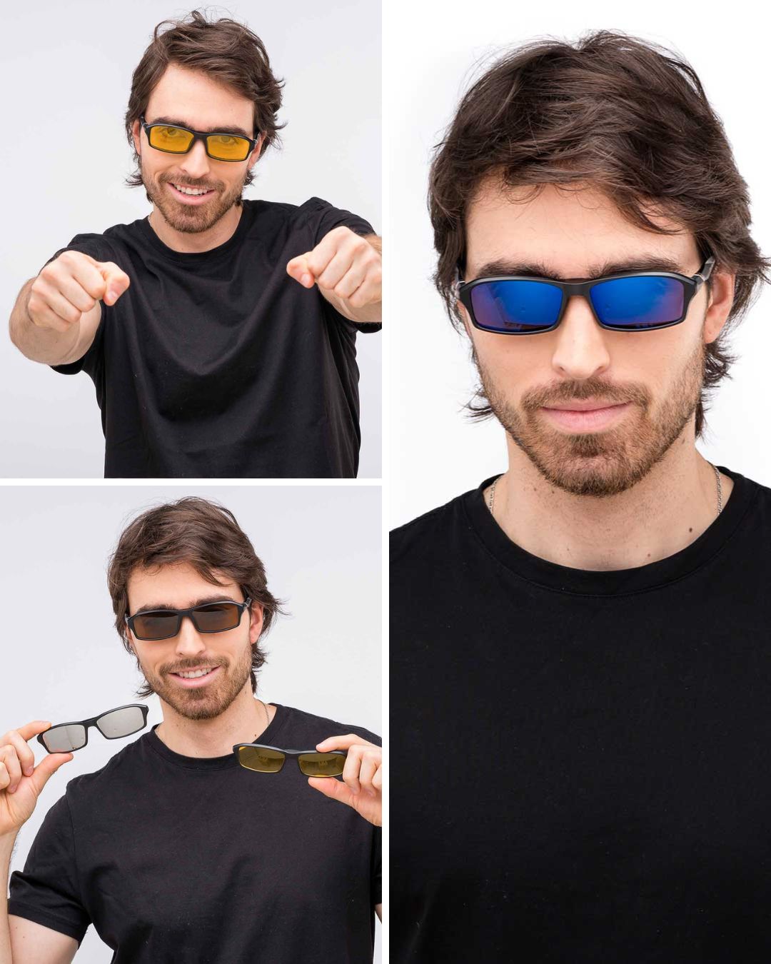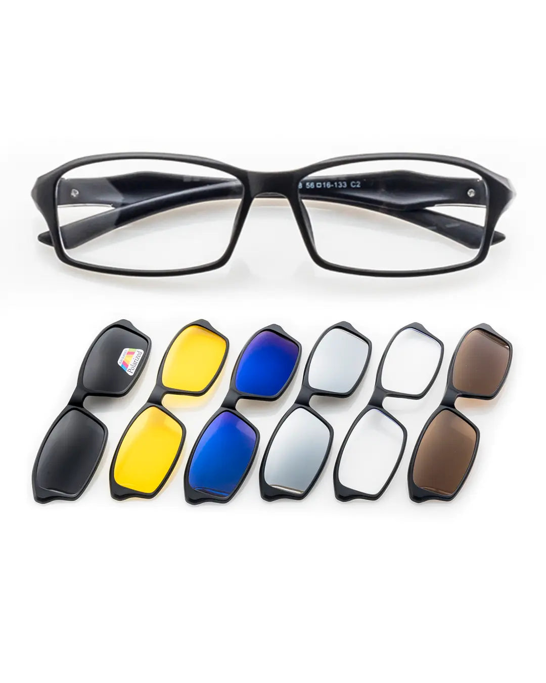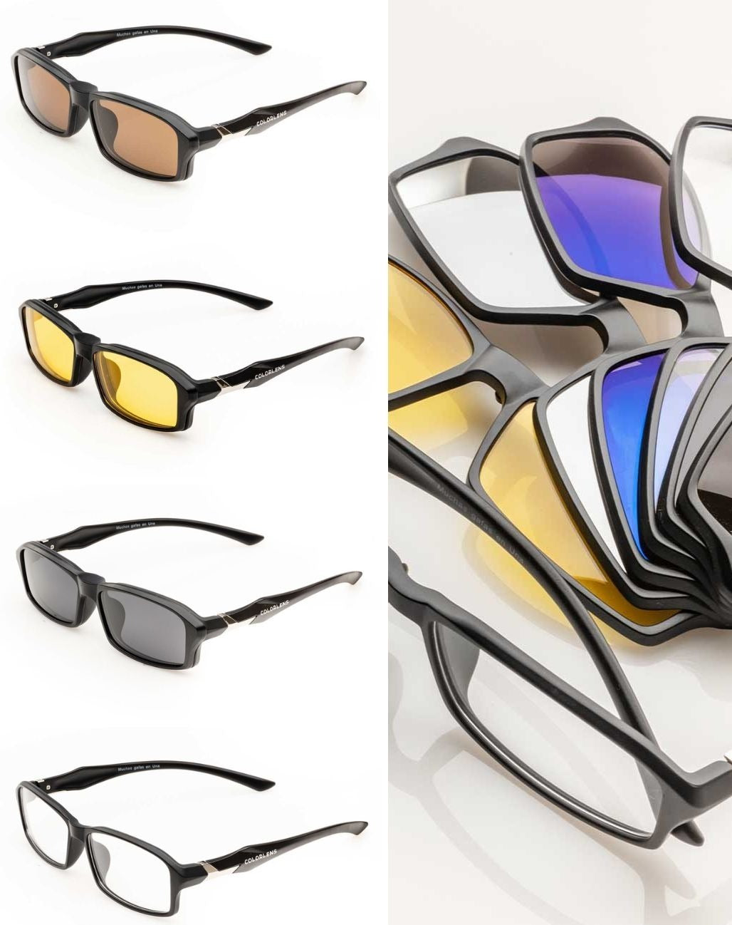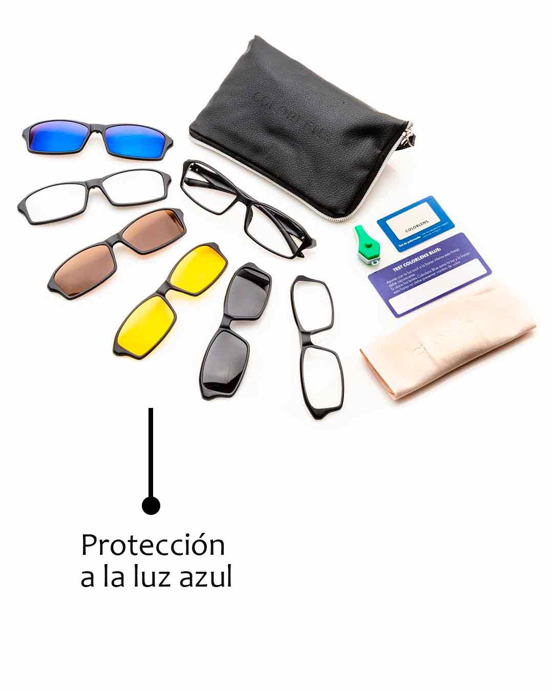 Gafas que constan de 1 montura fabricada en nylon TR90, material aeroespacial creado en Suiza, de alta resistencia y flexibilidad. A la montura se pueden instalar lentes con fórmula médica en cualquier óptica de confianza, y sobreponer, mediante ajuste magnético y clip de seguridad, 6 diferentes lentes funcionales con los siguientes usos: