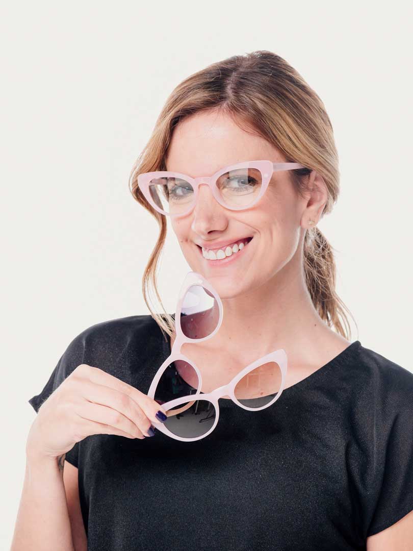 Gafas que constan de 1 montura fabricada en Policarbonato, material de alta resistencia y flexibilidad. A la montura se pueden instalar lentes con fórmula médica en cualquier óptica de confianza, y sobreponer, mediante ajuste magnético y clip de seguridad, 6 diferentes lentes funcionales con los siguientes usos: