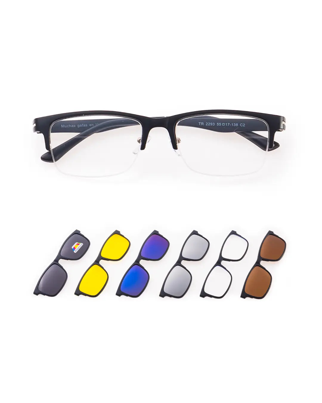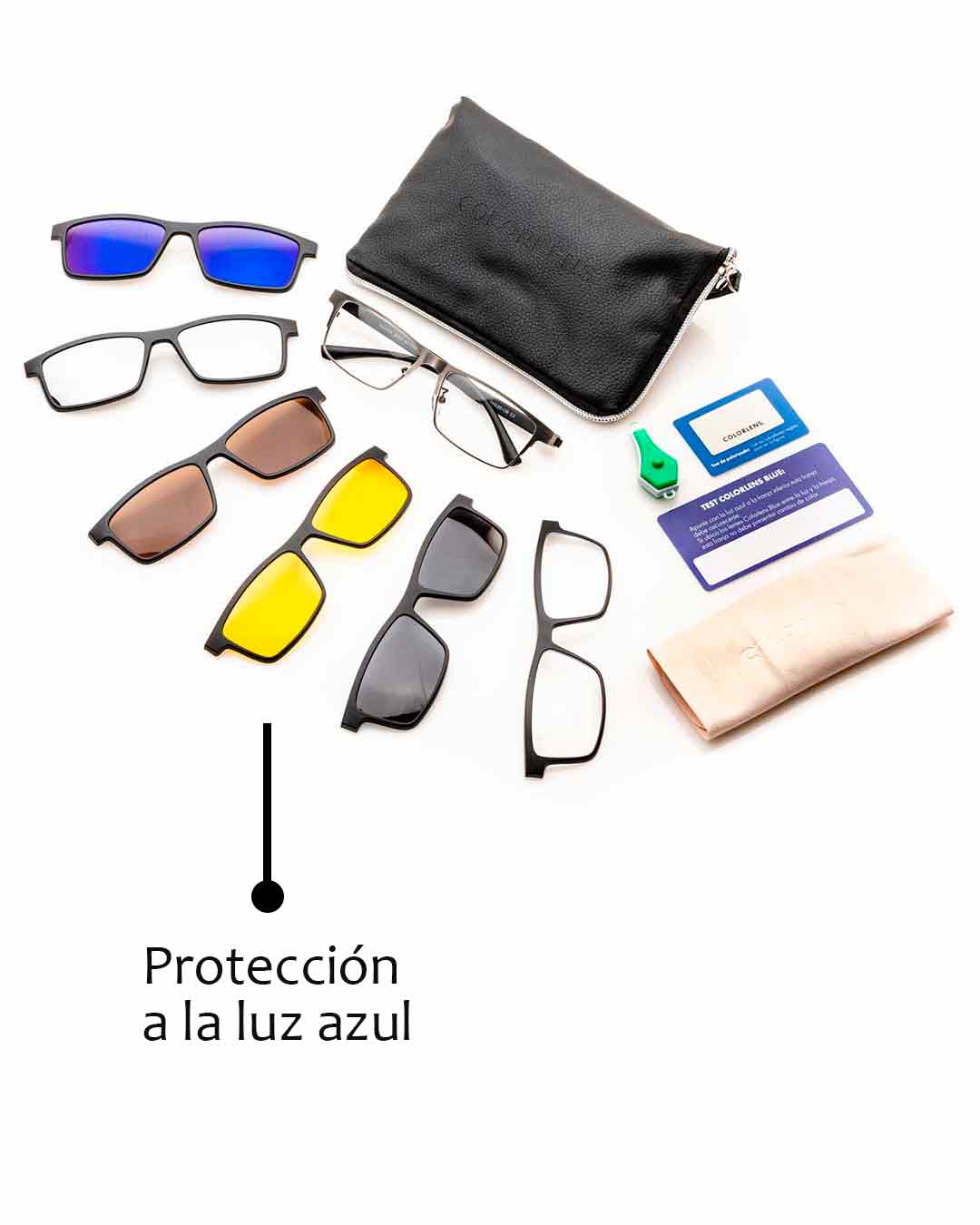 Gafas que constan de 1 montura fabricada en nylon TR90, material aeroespacial creado en Suiza, de alta resistencia y flexibilidad. A la montura se pueden instalar lentes con fórmula médica en cualquier óptica de confianza, y sobreponer, mediante ajuste magnético y clip de seguridad, 6 diferentes lentes funcionales con los siguientes usos: